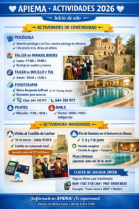 Os compartimos un resumen de las actividades de continuidad que desde APIEMA seguimos ofreciendo a lo largo de este 2026, pensadas para el bienestar, la participación y la convivencia de nuestros socios y socias. Psicología Taller de manualidades Taller de bolillo y tul Fisioterapia Pilates Baile Además, este año incorporamos dos actividades novedosas muy especiales: …